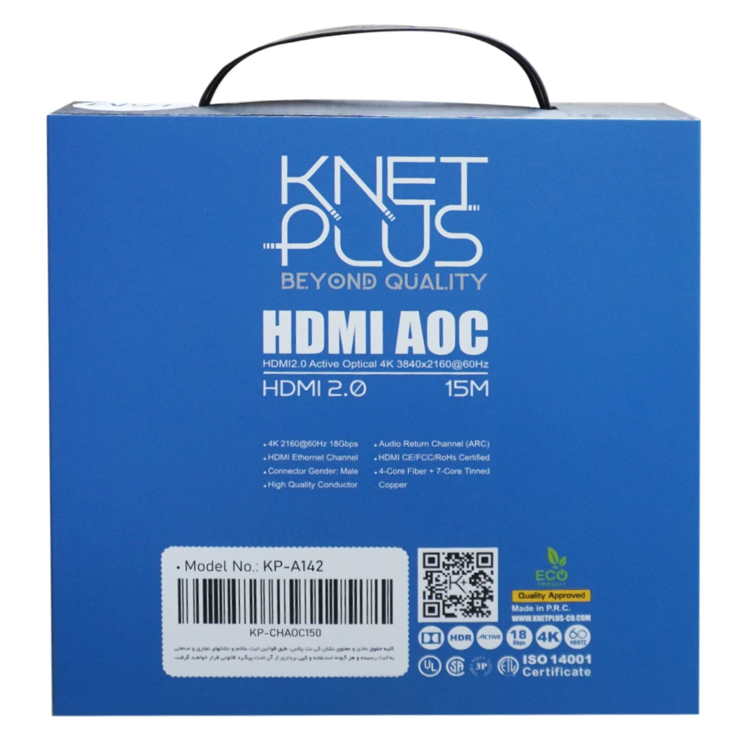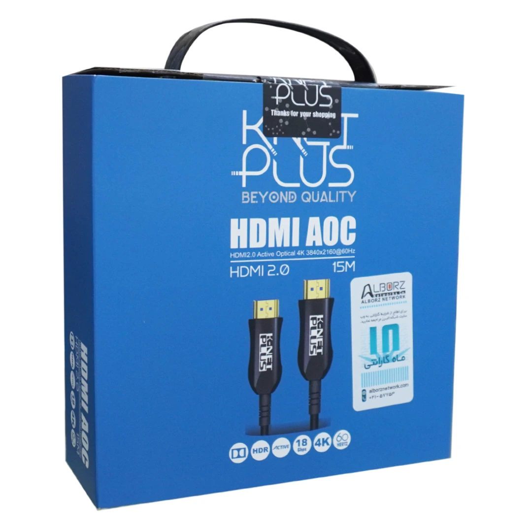 “کابل 2.0 HDMI فیبر نوری کی نت پلاس 15 متری Knet Plus KP-A142”یک رابط با سرعت انتقال و کیفیت ساخت بالاست. این کابل قابلیت پخش تصاویر سه بُعدی و پشتیبانی از وضوح تصویر 4K را دارد. این کابل برای استفاده در فواصل بالا و طیف وسیعی از دستگاه هایی که به نمایشگر های 4K متصل می شوند مانند کنسول های بازی، رایانه های رومیزی/همراه، DVD Player ،DVR و… مناسب می باشد.کابل فیبر نوری نویز پذیر نبوده و قیمت آن نسبت به کابل های مسی در فواصل بالا مقرون به صرفه تر می باشد. این محصول همچنین از پروتکل های زیر نیز پشتیبانی می کند: 3D / DHCP 2.2 / HDR10 / EDID / CEC / DDC / ARC .HDCP مخفف عبارت High-bandwidth Digital Content Protection به معنای «حفاظت از محتوای دیجیتال با پهنای باند بالا» است. بر همین اساس، HDCP به یک پروتکل ارتباطی تلقی میشود که از محتوای دیجیتالی کپیرایت در برابر ضبط شدن غیر قانونی محافظت میکند. به زبان سادهتر، اگر شما در حال پخش یک محتوای ویدیویی هستید، تمام ابزارهای مورد نیاز، از صفحه نمایش گرفته تا حتی کابل اتصالِ دستگاه پخش به مانیتور یا تلویزیون باید با فناوری HDCP سازگار باشند؛ در غیر این صورت، شما با یک صفحه سیاه یا حتی پیامهای خطا روبهرو خواهید شد.در واقع HDCP کاری میکند تا پخشکنندهی بلوری و کابل اطلاعات صوتی و تصویری را در قالب یک پیام رمزگذاری شده از طریق کابل به صفحه نمایش مثل تلویزیون هوشمند، پروژکتور یا حتی مانیتور انتقال دهند. سپس دو دستگاه، یعنی پخشکننده دیجیتال و صفحه نمایش به اصطلاح به یکدیگر دست میدهند (Handshake) تا کدهای امنیتی از طریق پروتکل HDCP بین دو دستگاه رد و بدل شود.