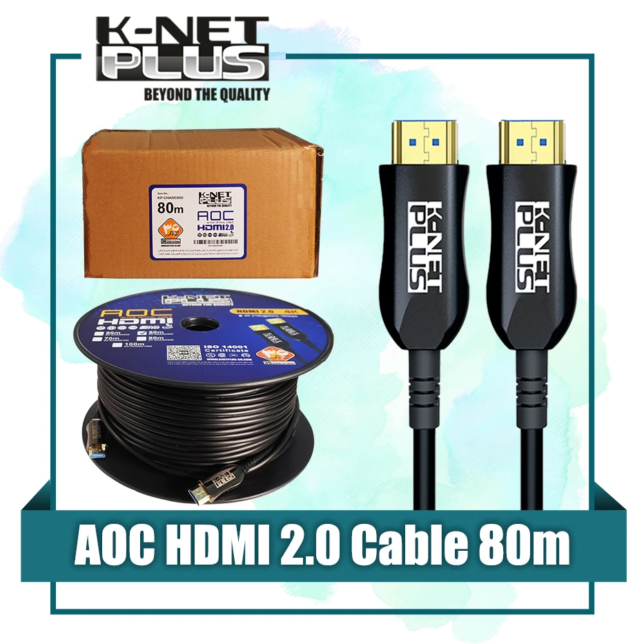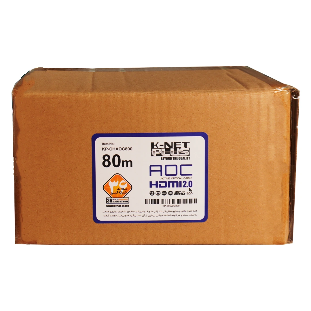 “کابل 2.0 HDMI فیبر نوری کی نت پلاس 80 متری Knet Plus KP-A150”یک رابط با سرعت انتقال و کیفیت ساخت بالاست. این کابل قابلیت پخش تصاویر سه بُعدی و پشتیبانی از وضوح تصویر 4K را دارد. این کابل HDMI برای استفاده در فواصل بالا و طیف وسیعی از دستگاه هایی که به نمایشگر های 4K متصل میشوند مانند کنسول های بازی، رایانه های رومیزی/همراه، DVD Player ،DVR و… مناسب میباشد. فیبر نوری نویز پذیر نبوده و قیمت آن نسبت به کابل های مسی در فواصل بالا مقرون به صرفه تر میباشد.