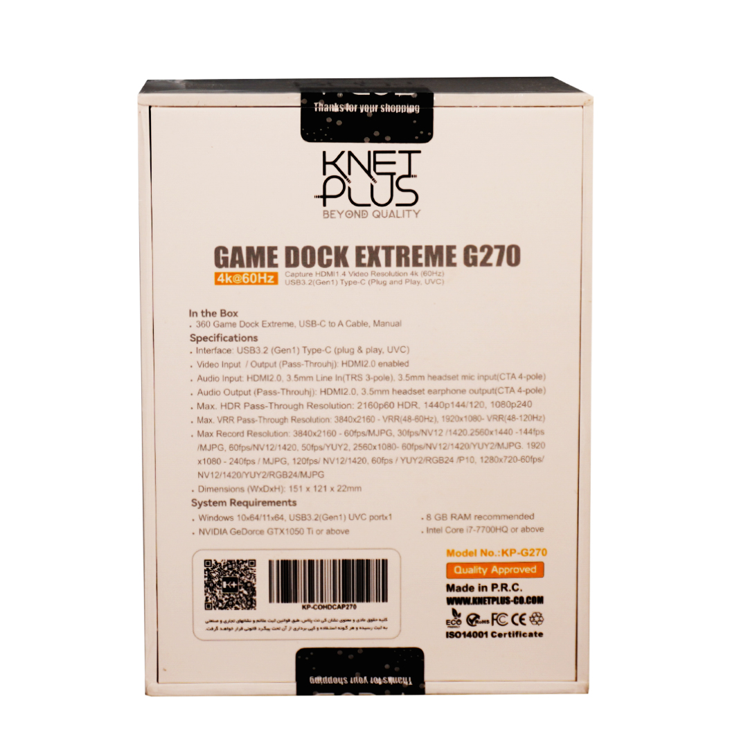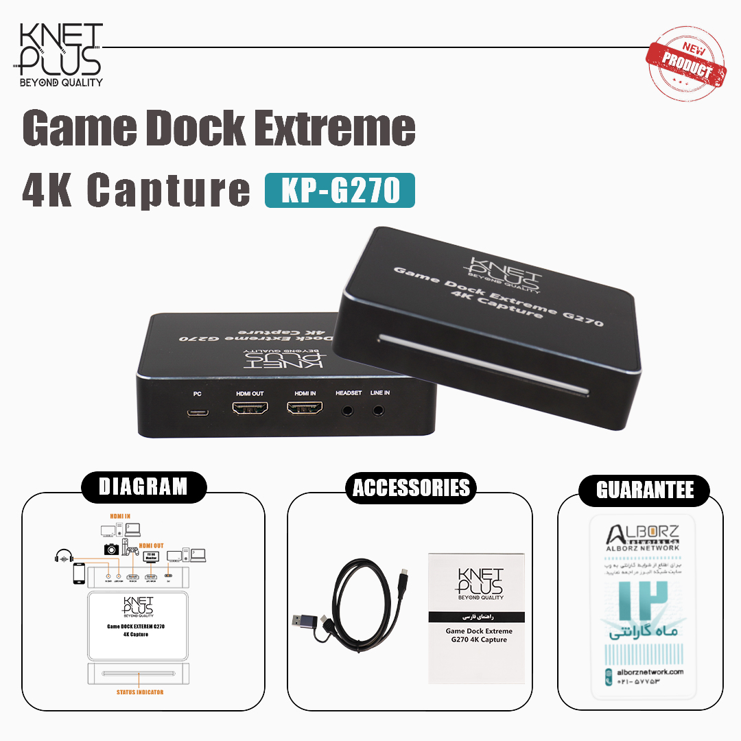 “کارت کپچر اکسترنال کی نت پلاس Knet Plus KP-G270“یکی دیگر از محصولات فوق العاده برند کی نت پلاس می باشد که امکانات بسیاری را در اختیار شما قرار میدهد. کارت کپچر کی نت پلاس KP-G270 از تکنولوژی جدید USB 3.2 Gen1 Type-C پشتیبانی میکند که سرعت فوق العادهای را برای انتقال اطلاعات به شما ارائه میدهد. این کارت کپچر تأخیر را به کمتر از 50 میلی ثانیه میرساند؛ حتی اگر برای پخش بازی از صفحه کپچر شده استفاده کنید، به سختی متوجه آن خواهید شد. بدون تاخیر بودن کارت کپچر کی نت پلاس و پشتیبانی از رزولوشن 4K p60 HDR، به شما این امکان را میدهد که از بازی گیم 4K HDR لذت برده و همچنین با کیفیت 4K p60 ضبط کنید. کارت کپچر اکسترنال کی نت پلاس از استاندارد UVC پشتیبانی کرده و دیگر نیازی به نصب دستی درایور نخواهید داشت. همچنین کارت کپچر کی نت پلاس دارای قابلیت plug and play است که به راحتی نصب شده و میتوان از آن بدون هیچ پیچیدگی استفاده نمود. این کارت کپچر از اکثر نرم افزارهای استریم مانند OBS Studio ، Wirecast، Adobe Flash Live Encoder و… پشتیبانی میکند.