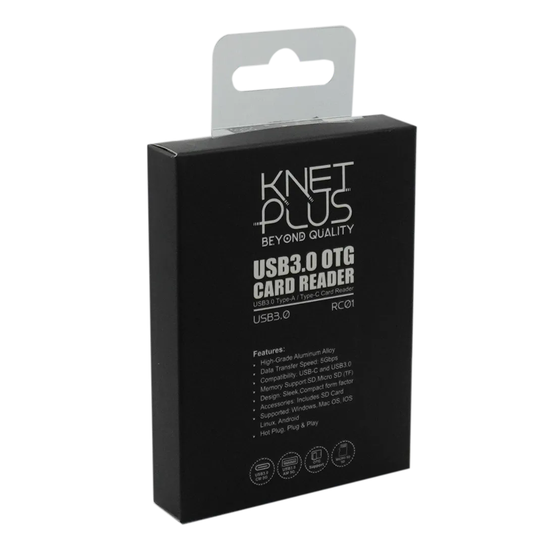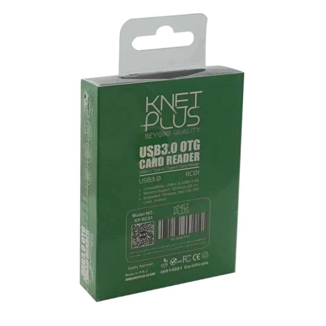 “کارت خوان کی نت پلاس Knet Plus KP-RC01”یک دستگاه کاربردی و چند منظوره است که برای کاربران نیازمند به انتقال سریع و آسان اطلاعات از انواع کارتهای حافظه طراحی شده است. این کارتخوان با وزن سبک دارای دو اسلات مجزا برای کارتهای حافظه SD و Micro SD (TF) است که امکان استفاده همزمان از هر دو کارت و انتقال اطلاعات بین آنها را فراهم میکند.اتصال این محصول از طریق دو رابط قدرتمند USB 3.0 و Type-C انجام میشود. رابط USB 3.0 امکان انتقال اطلاعات با سرعتی تا 5 گیگابیت بر ثانیه بر ثانیه را میدهد که برای انتقال فایلهای حجم بالا مانند عکسها و ویدئوهای با کیفیت بسیار مناسب است. پورت Type-C با سرعت انتقال داده تا 5 گیگابیت بر ثانیه تجربهای سریعتر و بهروزتر از جابجایی اطلاعات را برای شما رقم میزند.از دیگر ویژگی های این کارتخوان پشتیبانی از موبایلهایی با قابلیت OTG است که به شما اجازه میدهد بدون نیاز به کامپیوتر، کارت حافظه خود را مستقیماً به گوشی یا تبلت متصل کرده و به سرعت اطلاعات را انتقال دهید.