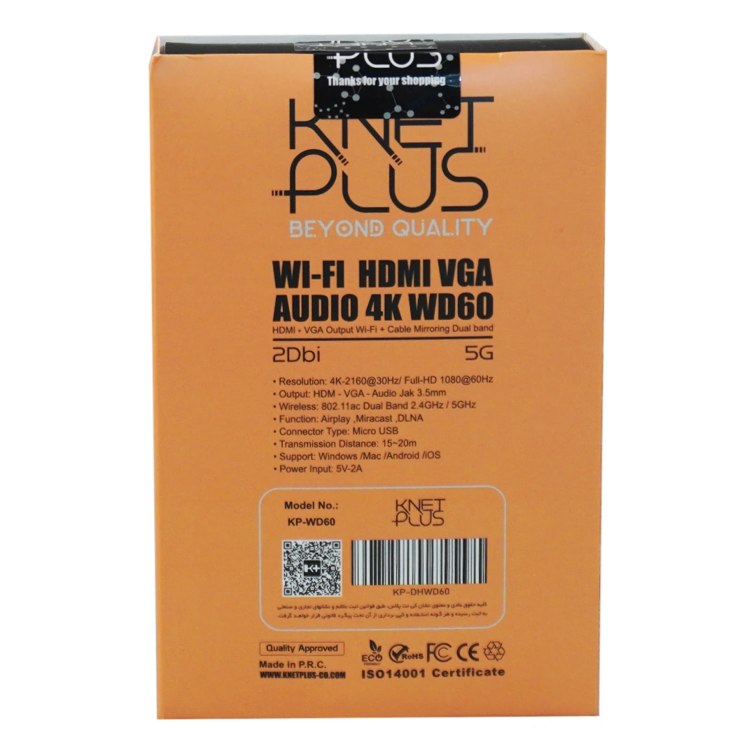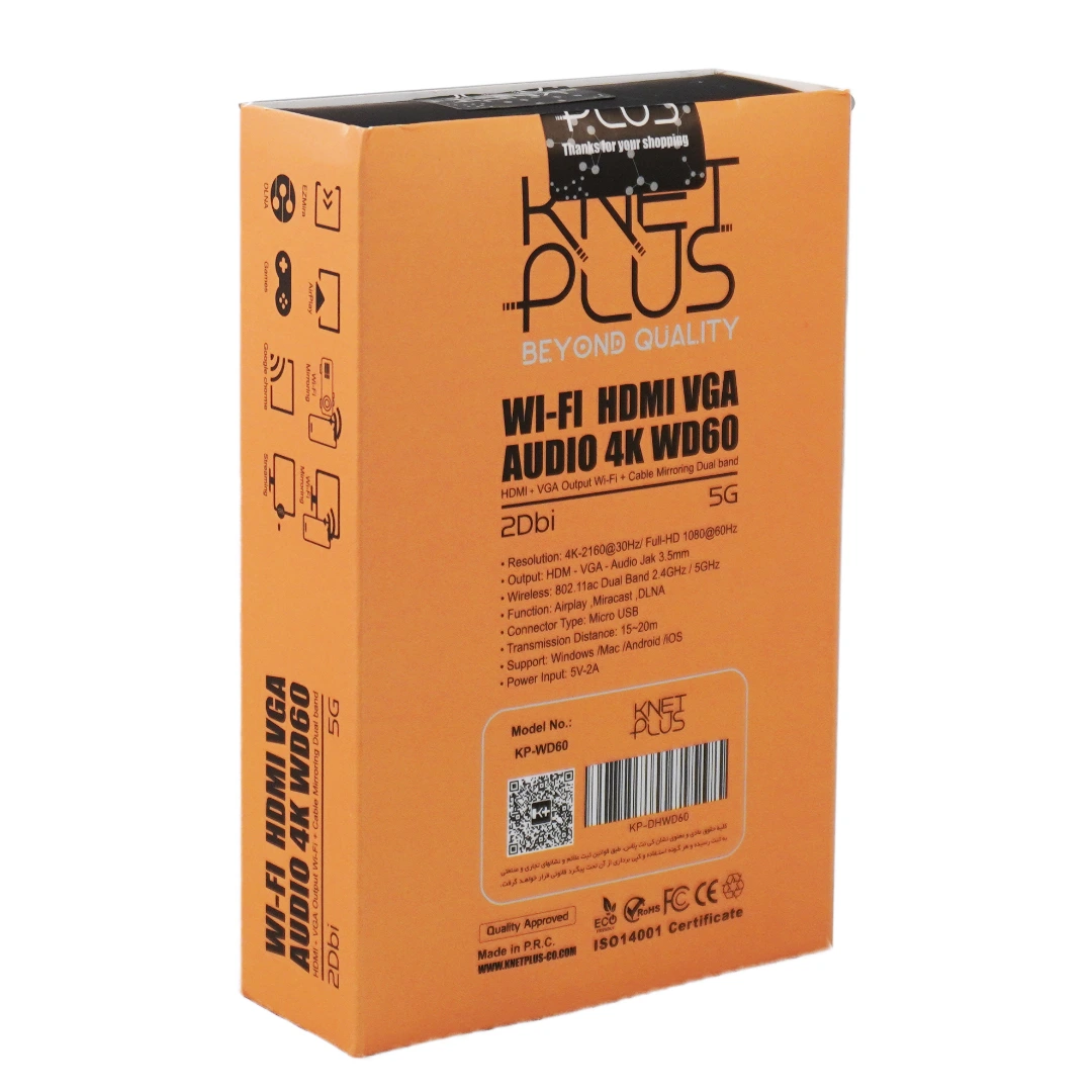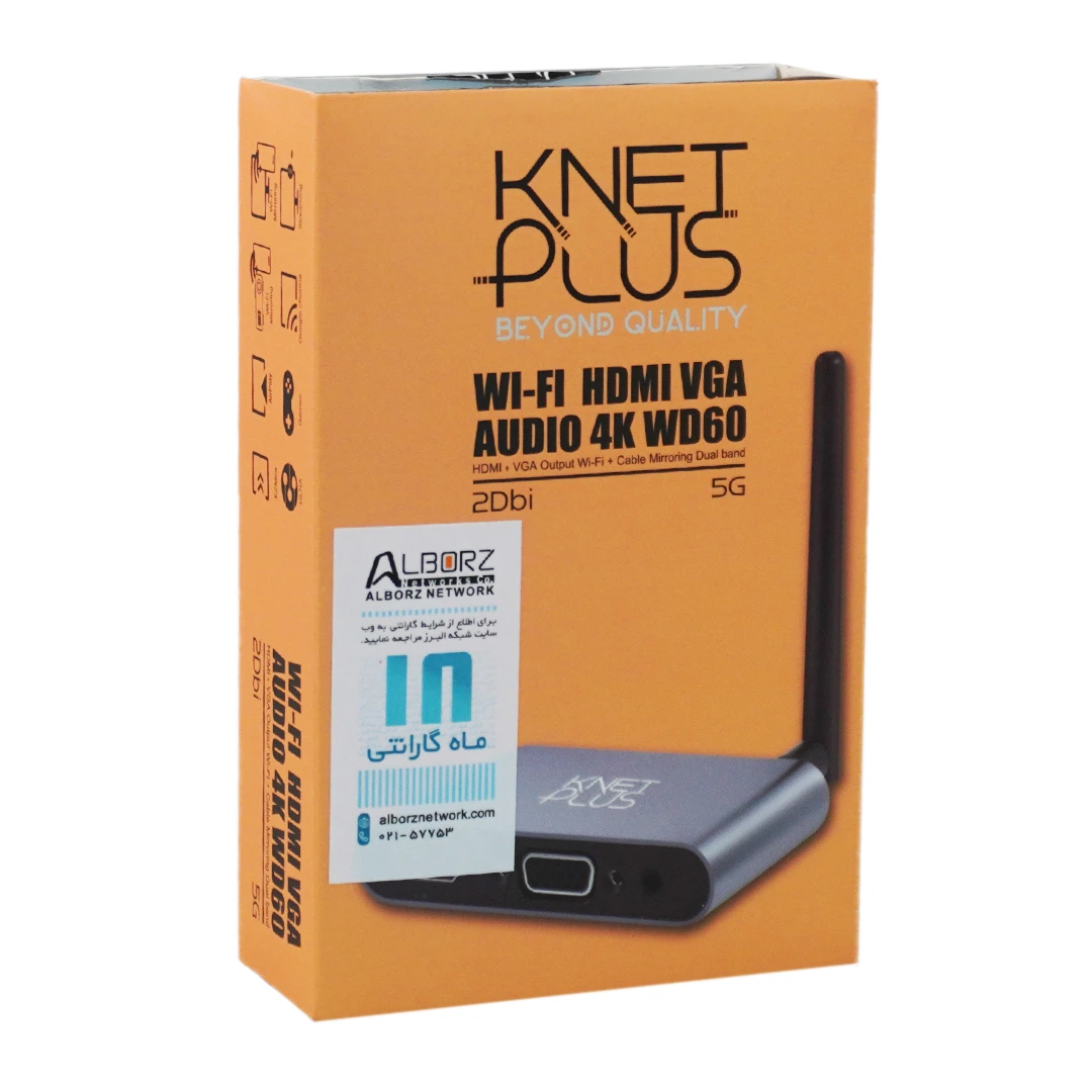 “دانگل بیسیم HDMI و VGA کی نت پلاس Knet Plus KP-WD60” ابزاری چند منظوره و قدرتمند برای انتقال بیسیم همزمان صدا و تصویر به دو نمایشگر مختلف است. این دانگل HDMI از کیفیت تصویری بالای 4K با نرخ تازه سازی 30 هرتز پشتیبانی میکند و با پشتیبانی از باندهای دوباند 2.4 و 5 گیگاهرتز، انتقالی پایدار و بدون تداخل را در محیطهای مختلف تضمین میکند.