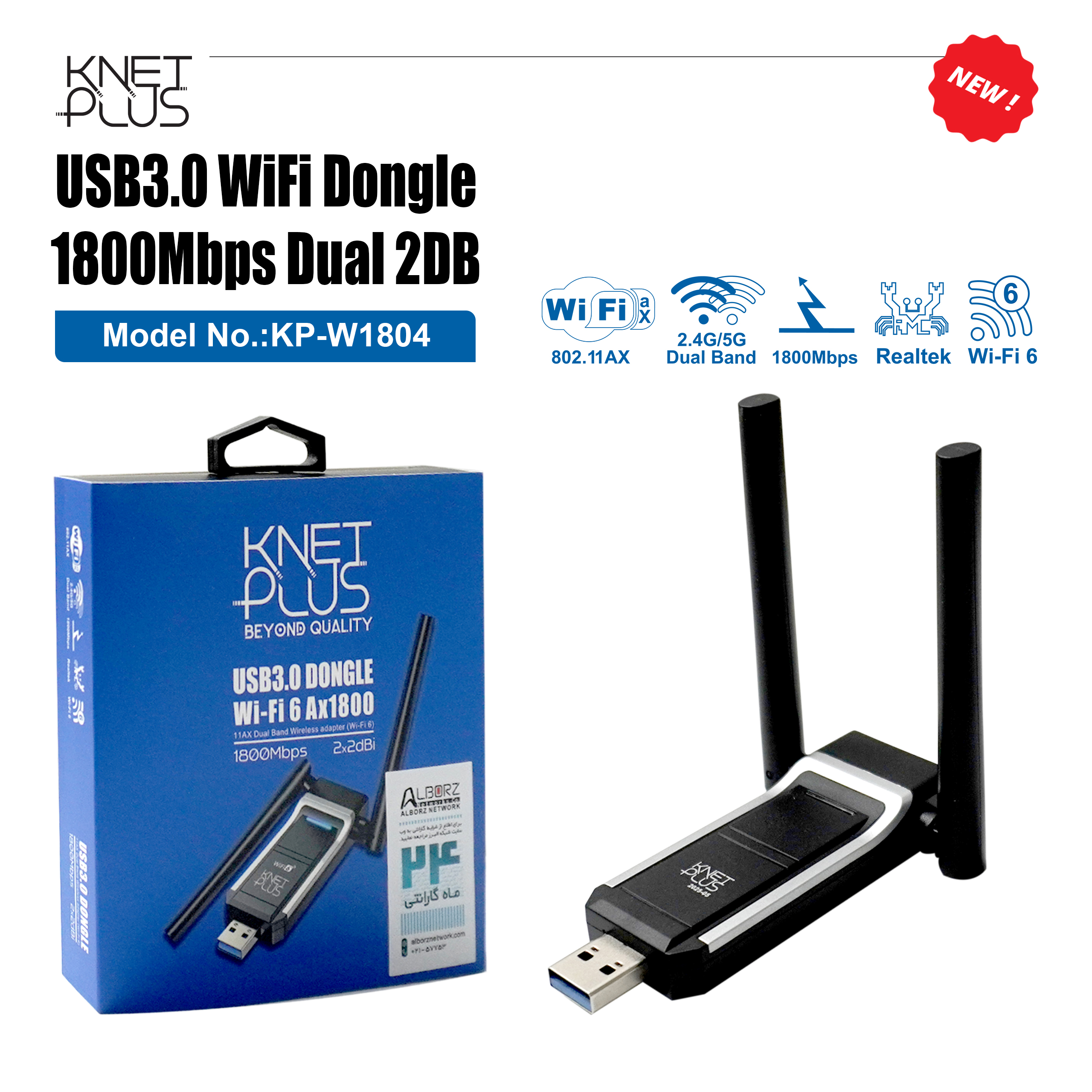 “کارت شبکه USB 3.0 بی سیم کی نت پلاس Knet Plus KP-W1804″محصول شرکت شبکه البرز می باشد که دارای دو آنتن 2dBi با بهره بالا و جدیدترین فناوری Wi-Fi 6 است. این آنتنهای خارجی دوگانه 2dbi ، انتقال و دریافت سیگنال قویتر را حتی از دورتر یا از روی دیوارهای متعدد به خوبی و بدون تاخیر انجام میدهند. سرعت بی سیم 5G میتواند به 1201 مگابیت در ثانیه برسد و سرعت بی سیم 2.4G میتواند به 573.5 مگابیت در ثانیه برسد. KP-W1804 از رابط USB 3.0 استفاده میکند که سرعت انتقال دادهها در آن 10 برابر سریعتر از USB 2.0 است.کارت شبکه KP-W1804 از نصب بدون درایور سیستم عامل های ویندوز 10 نیز پشتیبانی میکند که استفاده از آن انعطاف پذیر و راحت است. این دستگاه Wi-Fi 6 بیسیم دوبانده AX1800 این امکان را فراهم میکند تا ویدیوهای 4K را بدون هیچگونه قطعی و افت کیفیت تماشا کنید همچنین بازیهای سه بعدی کاملا روان اجرا خواهند شد. تجربه بازی و غوطه وری شما توسط نسل بعدی Wi-Fi 6 با انتقال دو بانده تا 1800 مگابیت بر ثانیه بهینه گردیده است.کارت شبکه U18a هدف اتصال کابل USB و طراحی به سبک دسکتاپ یافتن بهترین نقطه برای دریافت است. برای استقرار انعطاف پذیر از یک راه اندازی آسان و دسکتاپ پسند لذت ببرید.با رایانه رومیزی و لپ تاپ برای Windows 10/Windows 11 کار می کند. انتخابی عالی برای پخش جریانی HD و بازی های آنلاین بدون تاخیر.