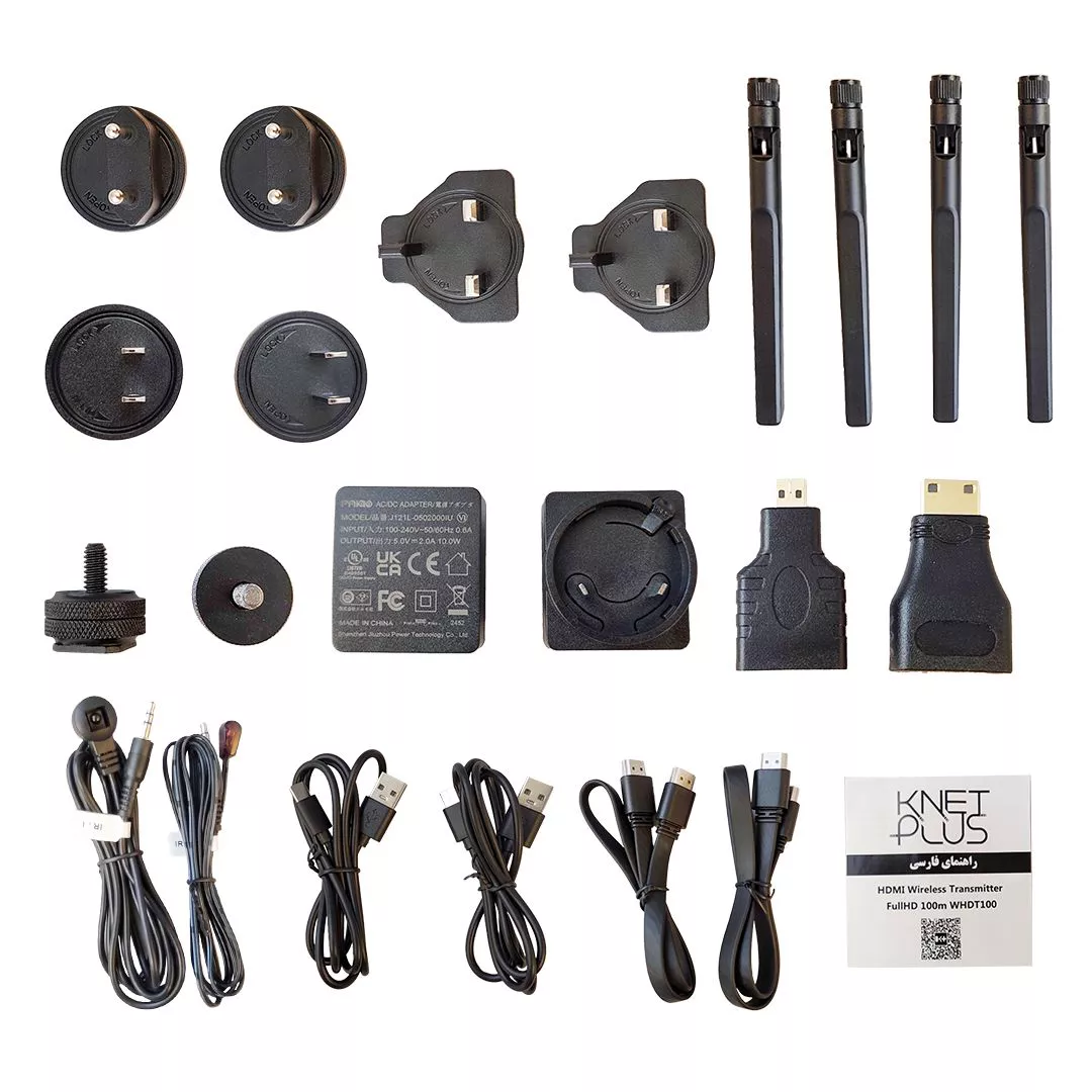 اقلام همراه : 4 عدد آنتن ، 2 عدد باطری لیتیوم شارژ ، 2 عدد کابل Type C ، HDMI و IR و سری مخصوص برای اتصال دستگاه به پایه دوربین ، مبدیل های Micro HDMI و Mini HDMI ، دو عدد آداپتور برق به همراه تبدیل های مختلف ، دفترچه راهنمای فارسی محصول